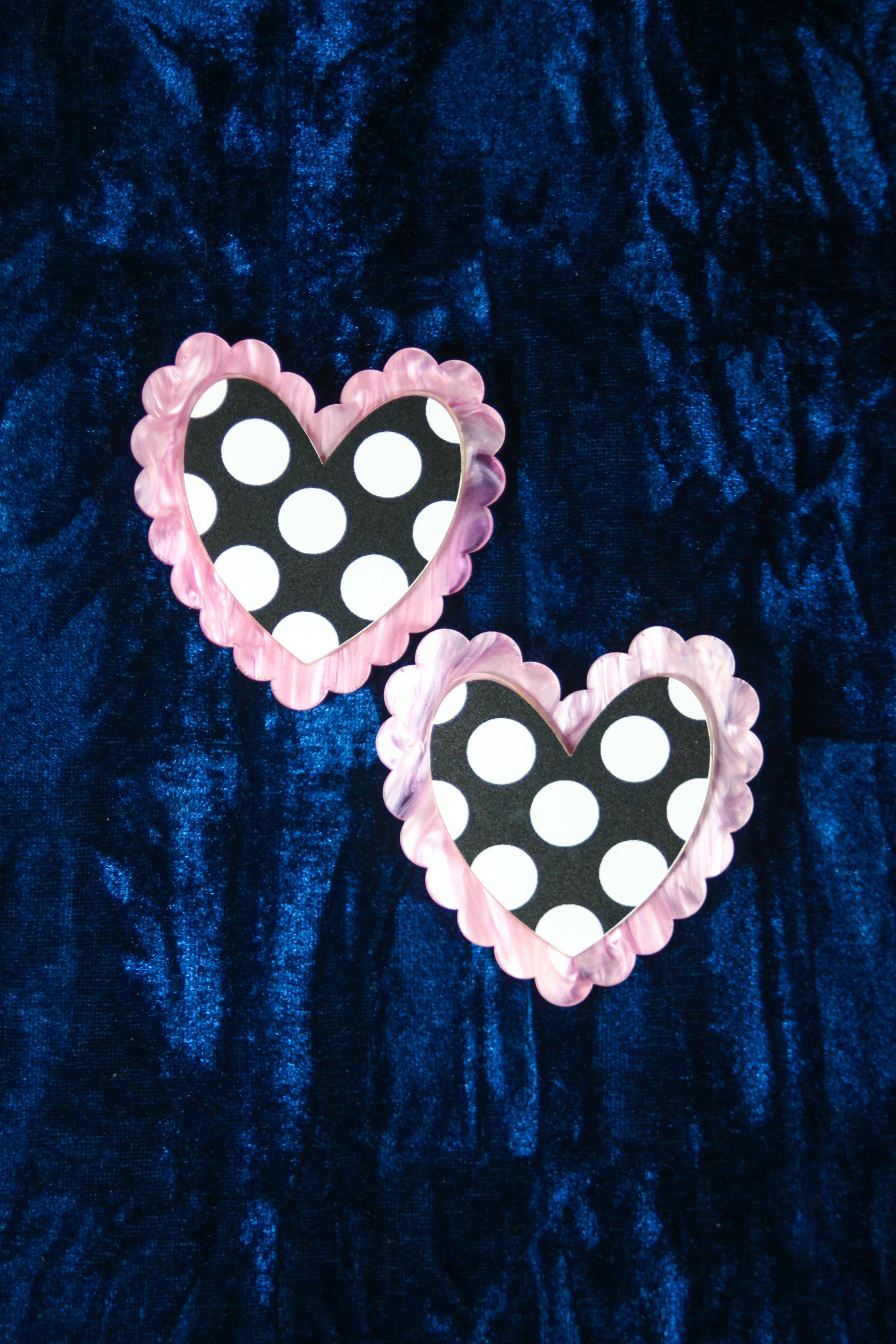 Add a playful pop of pattern to your look with our Scalloped Heart Stud Earrings! Featuring a soft pink outline and a fun black and white polka dot inner, these 6cm studs are the perfect mix of sweet and bold.