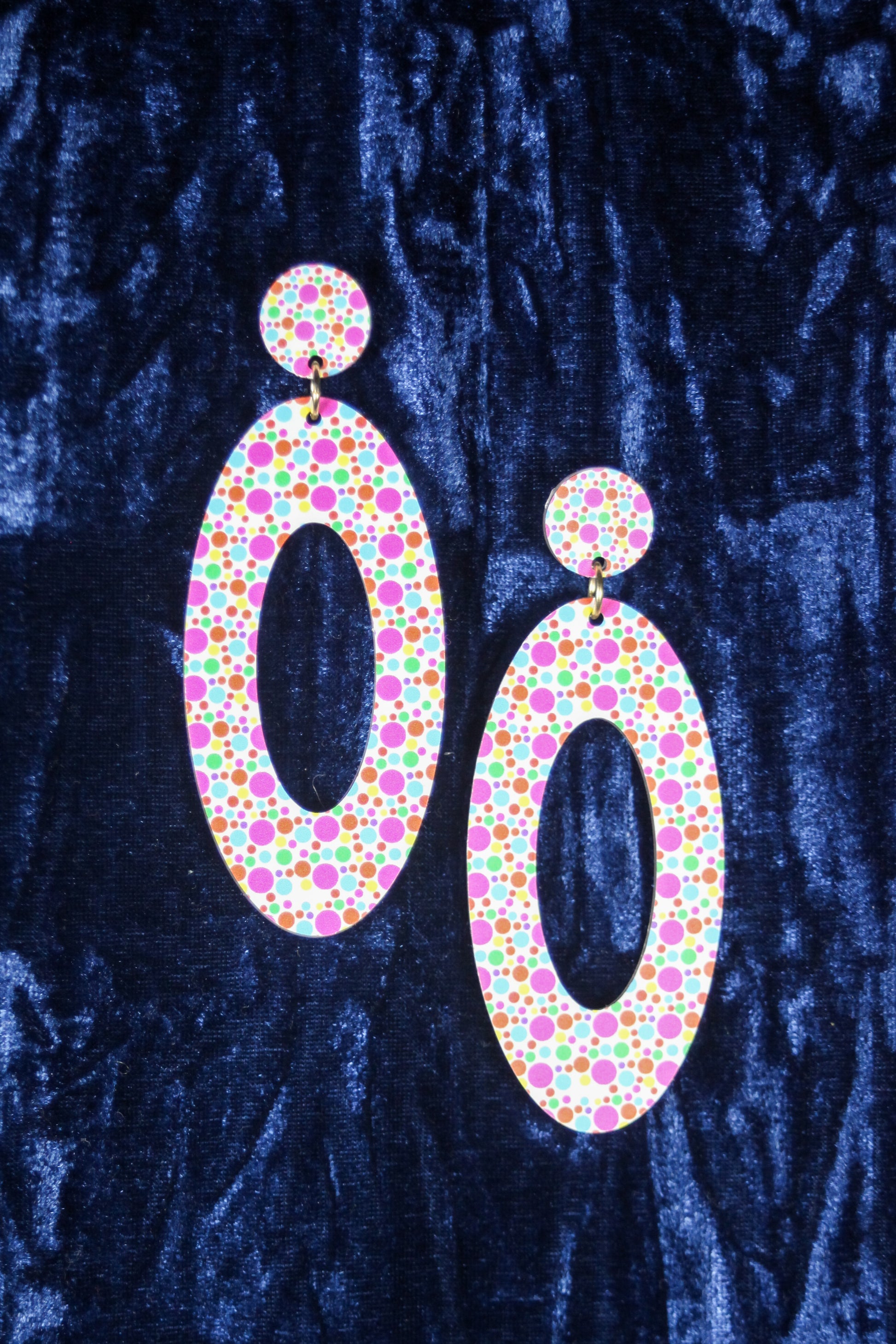 Add a pop of fun to your look with these Multi-Colour Polka Dot Earrings! At 10cm, they’re the ultimate statement piece, bursting with vibrant, eye-catching dots. Despite their bold size, they’re super lightweight and comfy, making them perfect for all-day wear.